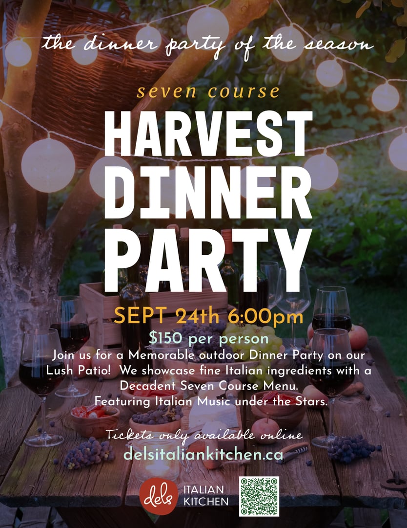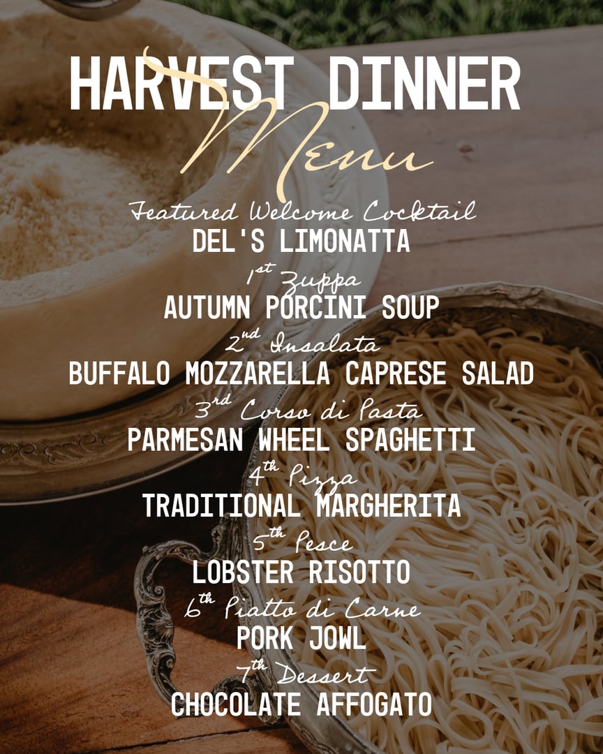 We feast on 7 incredible courses of Italian cuisine, partake in great wines and connect over one long table seating on our patio! With romantic Italian music and playful tablescape. Courses will be as follows, but final dishes will be a delightful & delicious surprise for our guests!